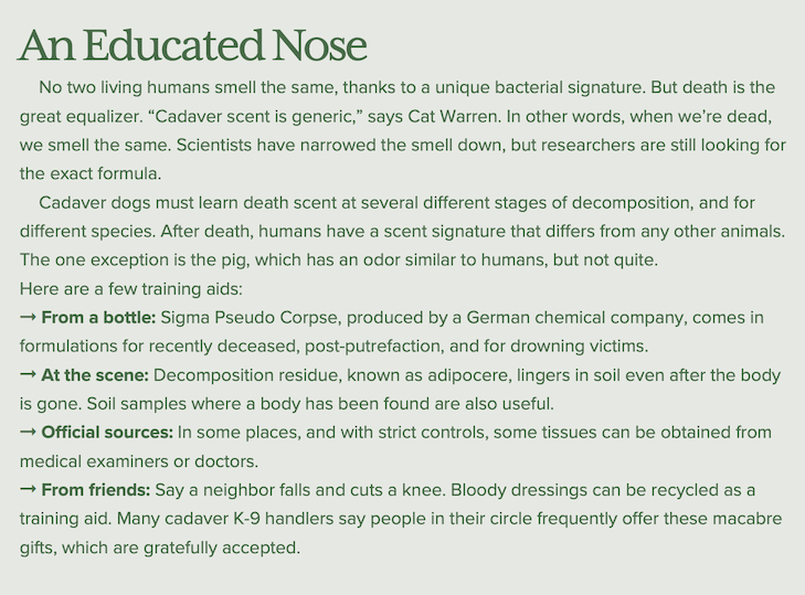 Para estos detectives de cuatro patas, la muerte es solo otro olor, y rastrearla es solo otro juego.